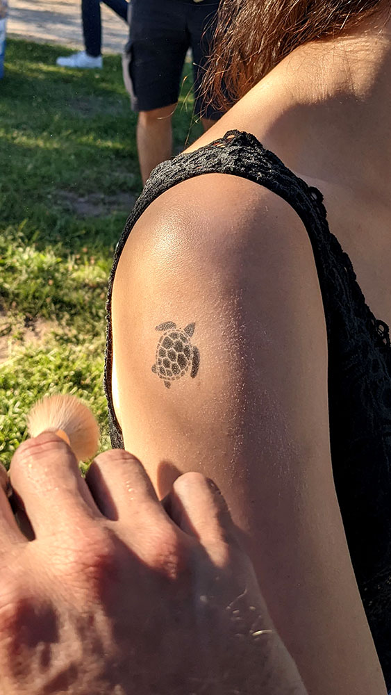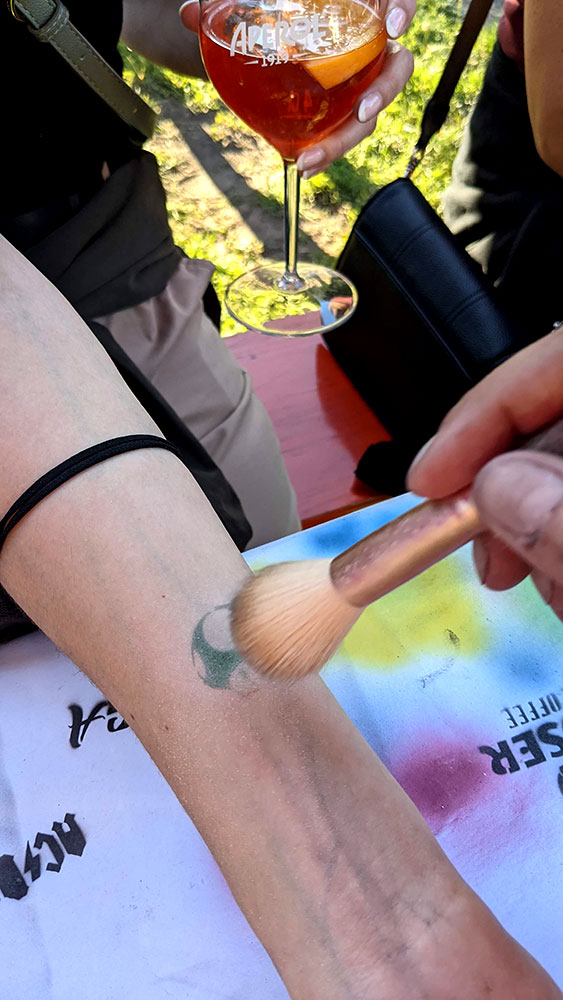 Aus einer Vielfalt von über 200 Motiven konnten die Festival-Besucher ihr Lieblingssymbol wählen. In wenigen Minuten ist das temporäre Tattoo fertig: Motiv und Farbe wählen, mit viel Fingerspitzengefühl sprühen und schließlich abpudern! Durch das Babypuder-Finish werden die temporären Tattoos wischfest und halten selbst auf verschwitzter Party-Haut – damit die Airbrush-Tattoos auch sicher jedes Tänzchen bis spät in die Nacht mitmachen ...