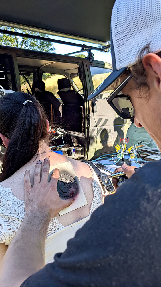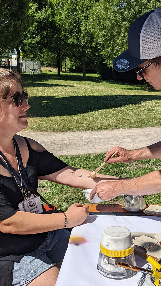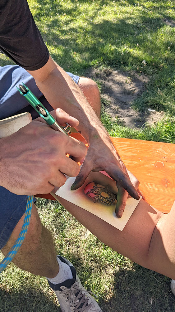 Bei strahlendem Sonnenschein und hochsommerlichen Temperaturen hat das Team von Airbrush Tattoo Paderborn die Sprühpistolen ausgepackt: Am Samstag, 02.07.2022 konnten sich die Festival-Besucher auf dem Monte Scherbelino ihre Lieblingsmotive farbenfroh auf die Haut sprühen lassen.